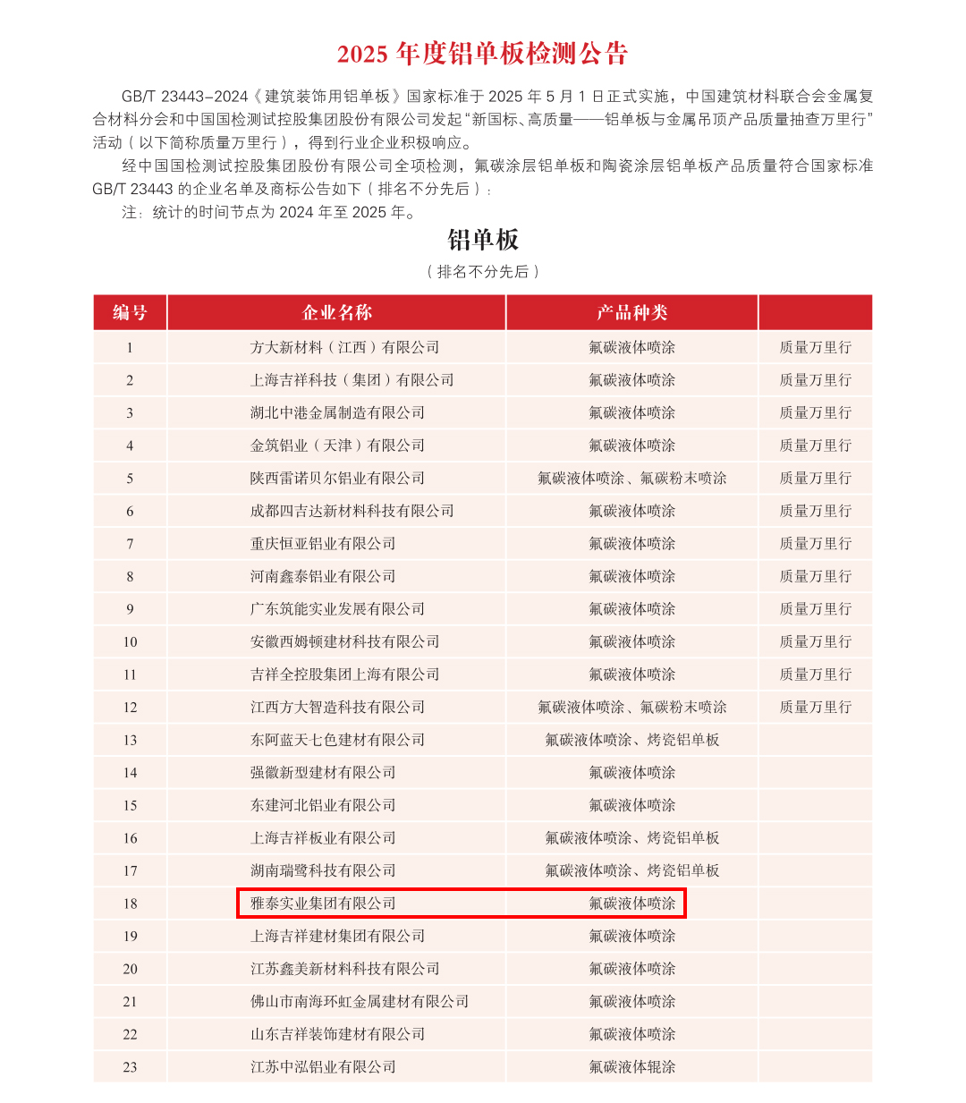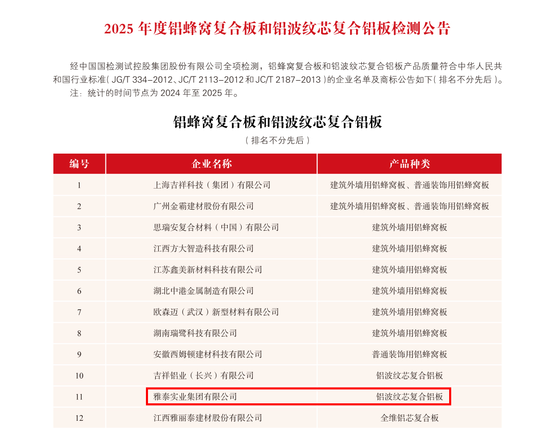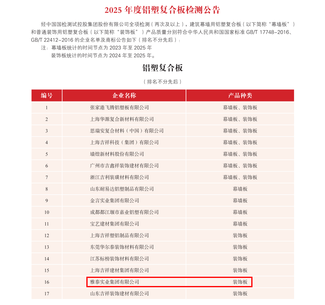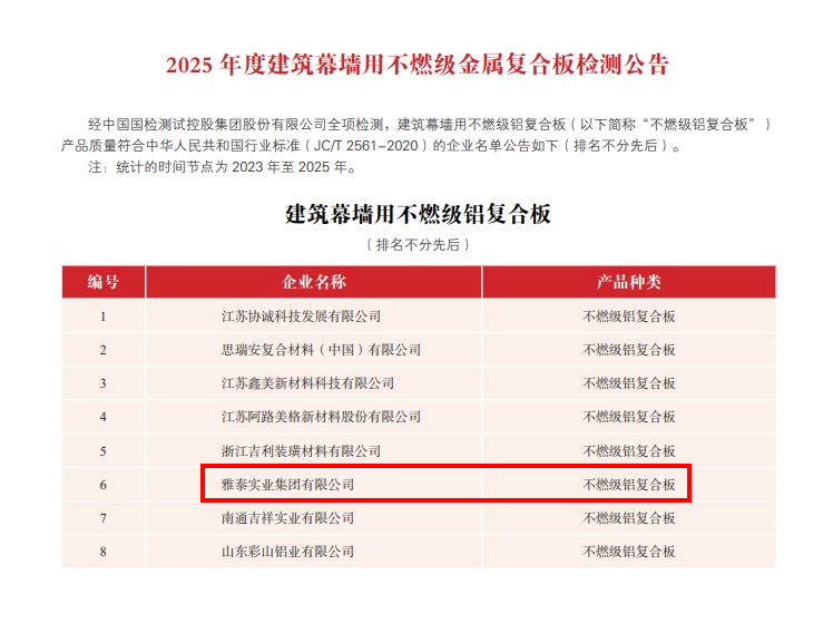 為加強(qiáng)金屬復(fù)合材料行業(yè)品質(zhì)建設(shè),提高行業(yè)整體質(zhì)量,金屬復(fù)合材料分會(huì)聯(lián)合中國國檢測(cè)試控股集團(tuán)股份有限公司對(duì)符合全項(xiàng)檢測(cè)要求的鋁塑復(fù)合板、鋁單板、建筑裝飾用不燃級(jí)金屬復(fù)合板、鋁蜂窩復(fù)合板和鋁波紋芯復(fù)合鋁板等生產(chǎn)企業(yè)頒發(fā)2025 年度產(chǎn)品合格證,具體公告如下: