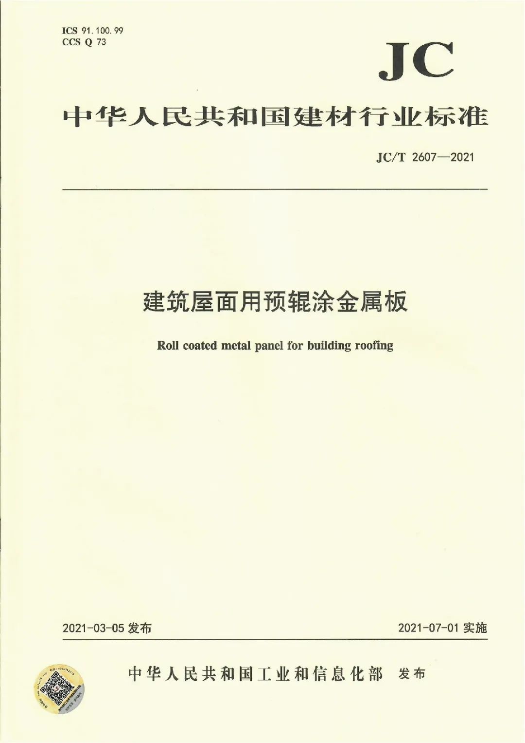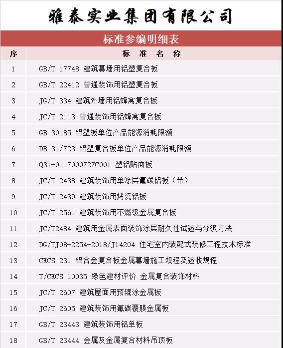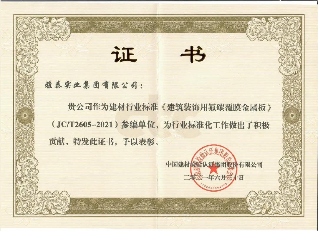 近日,由中國(guó)建筑材料聯(lián)合會(huì)提出,雅泰實(shí)業(yè)集團(tuán)參與起草的《JC/T2605-2021建筑裝飾用氟碳覆膜金屬板》、《JC/T2607-2021建筑屋面用預(yù)輥涂金屬板》兩項(xiàng)行業(yè)標(biāo)準(zhǔn)于2021年3月5日發(fā)布,同年7月1日正式實(shí)施,公司技術(shù)部經(jīng)理林葉挺為此次兩項(xiàng)行業(yè)標(biāo)準(zhǔn)的主要起草人之一。